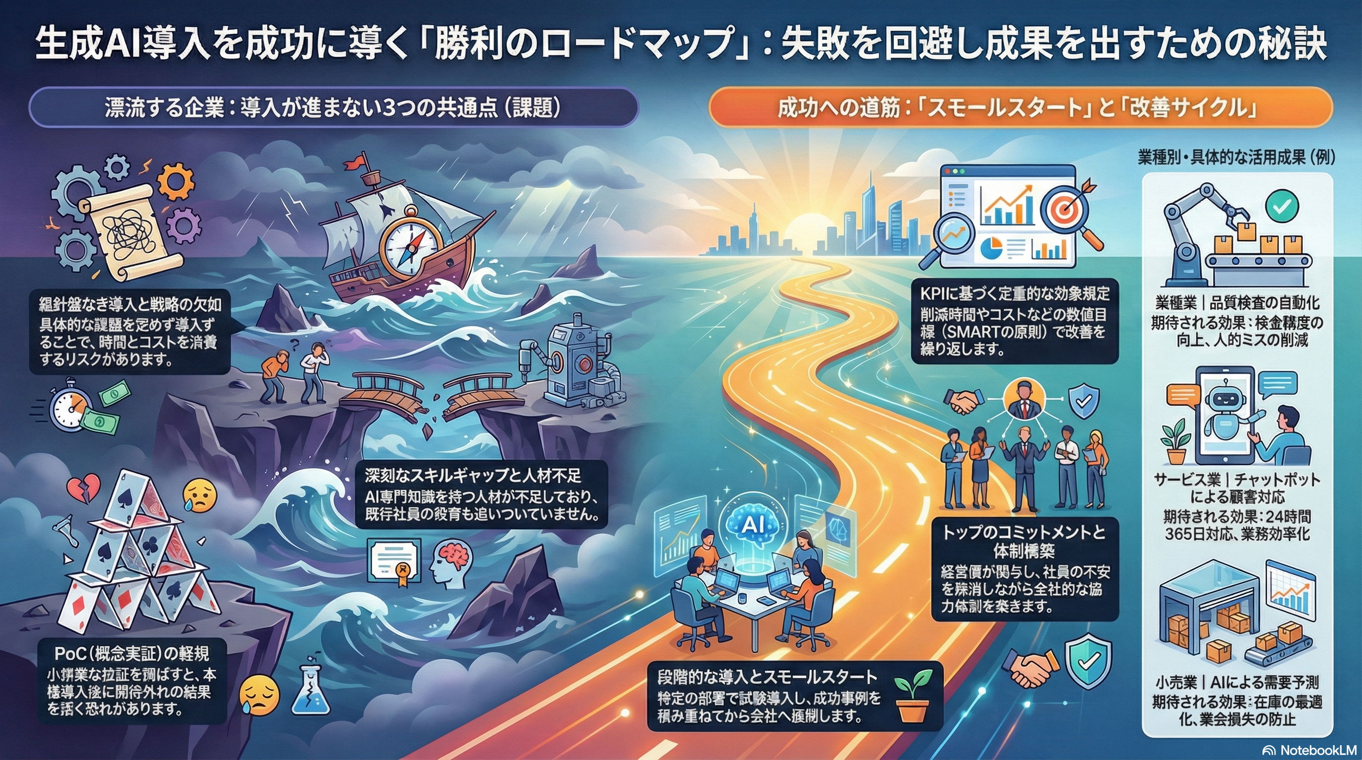 多くの企業が、具体的な目的や戦略を持たずに生成AIを導入してしまい、期待される効果を得られないことがあります。これは、まるで羅針盤を持たずに大海原に漕ぎ出すようなもので、どこへ向かえば良いのか分からず、漂流してしまう危険性があります。