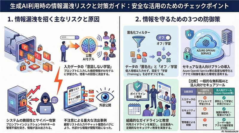 情報漏洩の原因としては、入力データの学習、不正アクセス、生成AI自体のバグ、悪意のあるサイバー攻撃などが挙げられます。特に、プロンプトインジェクション攻撃は、生成AIの意図しない動作を引き起こし、情報漏洩につながる可能性があります。